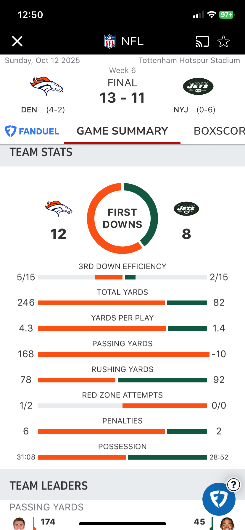 Denver beat the Jets 12-8 and had 9 sacks. The Jets had 82 yards total offense and -10 yards passing. Oi vay. Justin Fields might be looking for work soon.