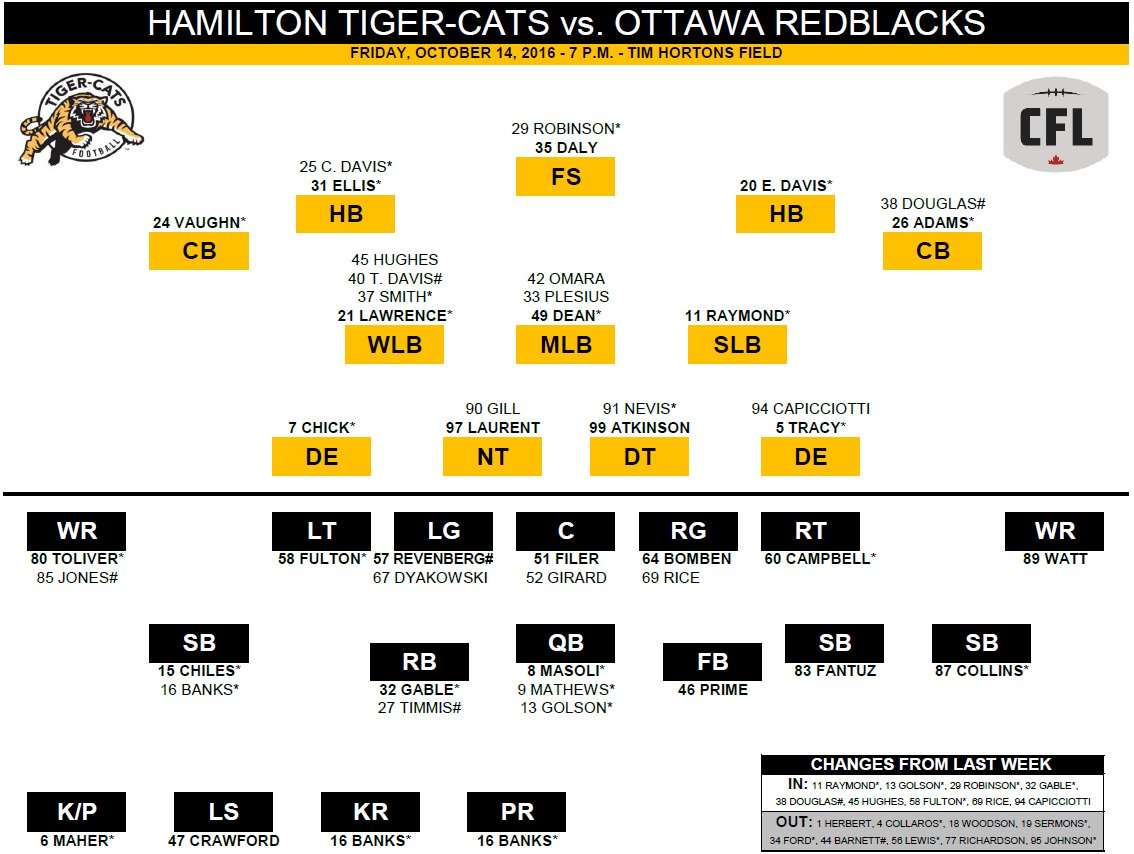 Not quite as much change as I thought there might be. Beyond the depth chart, as presented, I'm concerned that Tracy might be the INT scratch, not having heard anything more on his being taken out of the Day 3 practice, and the movement of Tasker to the 6-Game Injured List 4 weeks after being hurt. I wish the media didn't work so closely with the team on keeping injury details secret. We have 23 players listed as injured and I don't think I could accurately say what the injury issue is with even a half dozen of them. I also don't understand Landry and Olson being taken off the 6-Game list on Oct. 10, according to Transactions - Football Player Trades and Signings - CFL.ca, and yet still being on it according to the roster published with this depth chart.
