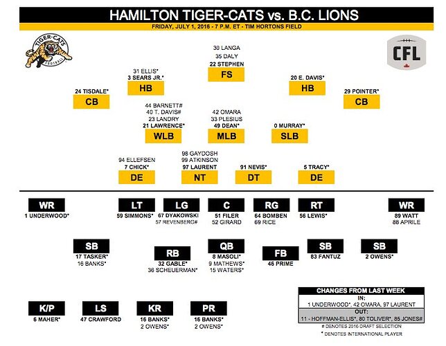 #Ticats DT @tedlaurent added to the roster for game vs. #BCLions. REC @TiUnderwood in for @TToliver80 , LB Omara for REC Jones. #CFL
