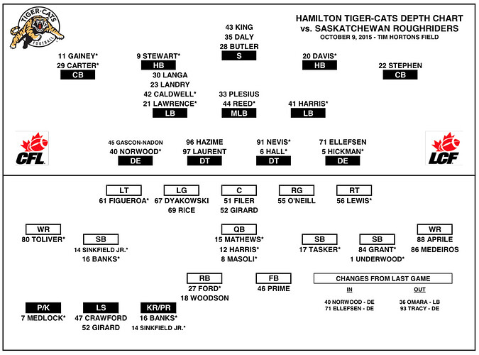 Good to have Norwood back on the D-Line and Carter getting a start. Five games to go until the end of the season, all important in the CFL race for the east and playoffs.